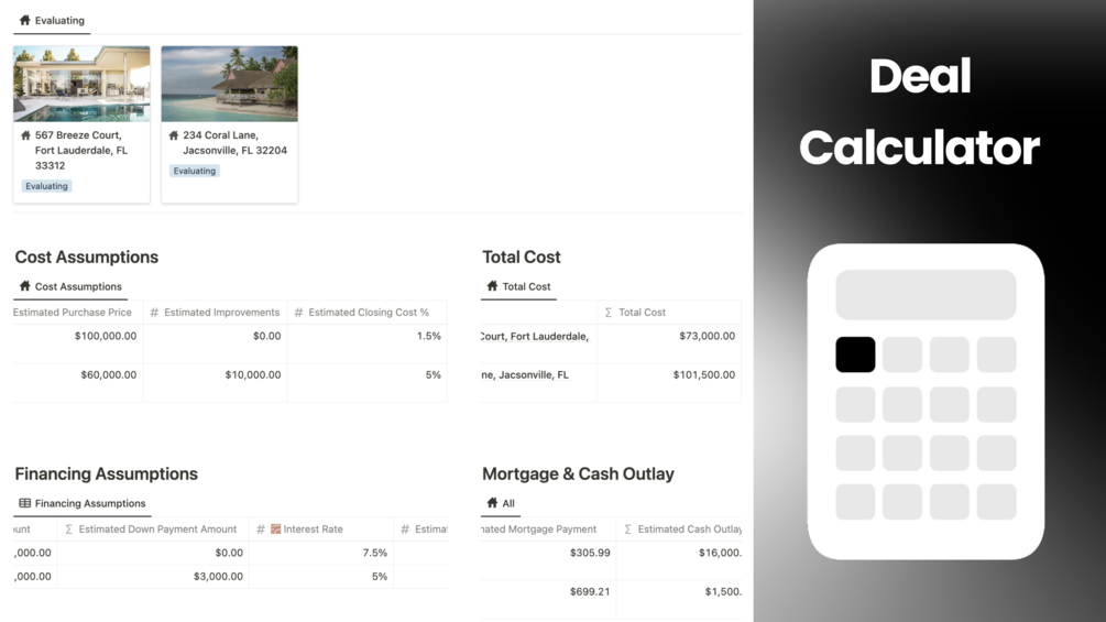 🤝 Deal Calculator: Make informed decisions effortlessly with the integrated deal calculator. Input property details, financing options, and projected expenses to instantly analyze potential deals. No more guesswork – the calculator provides clear insights into profitability, ensuring you invest wisely.